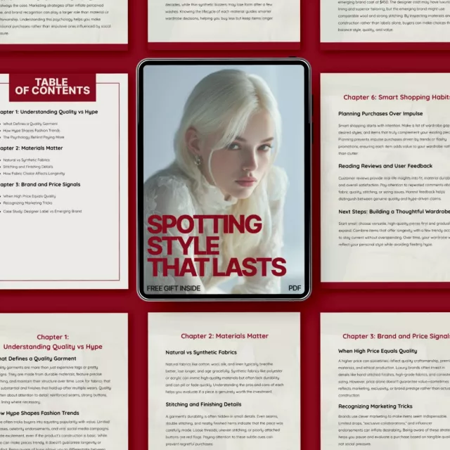 This guide is perfect for anyone looking to refine their personal style without falling victim to fleeting trends. Whether you’re a fashion enthusiast, a mindful shopper, or someone ready to make smarter clothing choices, this eBook is tailored for you. By learning how to spot quality vs hype clothing items, you’ll be empowered to curate a wardrobe that reflects your unique style and stands the test of time.