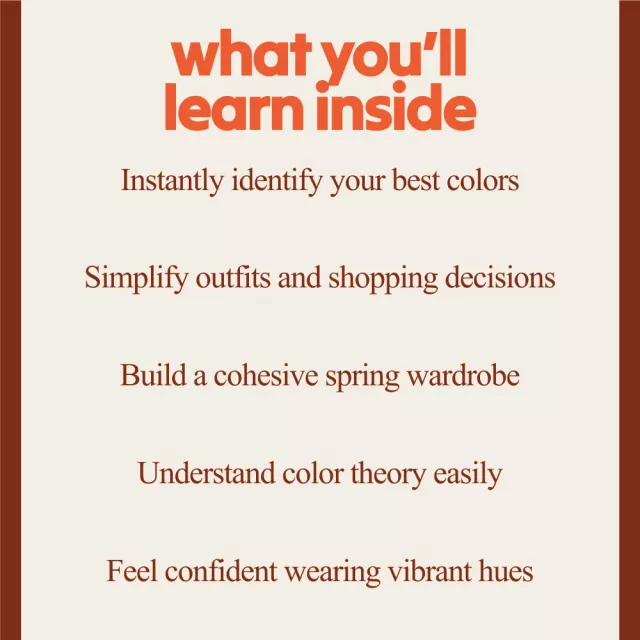 This bundle is perfect for anyone drawn to bright, warm, and fresh colors—style beginners, fashion lovers, personal stylists, or anyone exploring spring seasonal color analysis to simplify daily outfit choices.