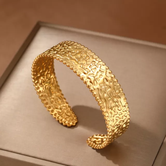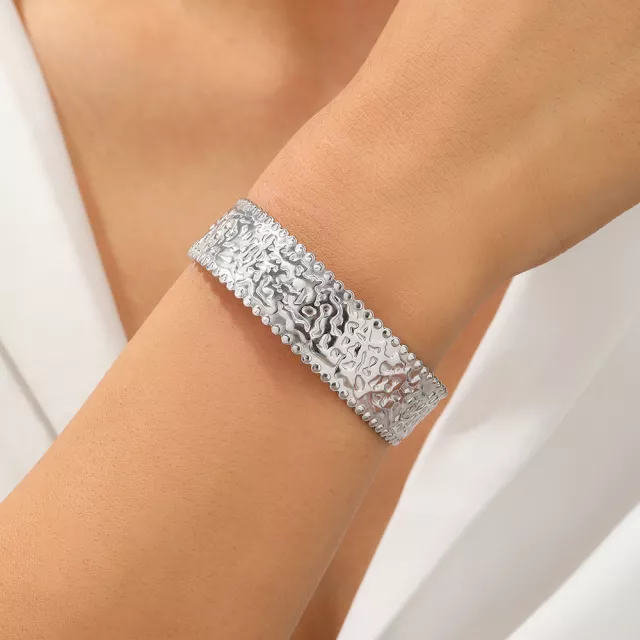 This bracelet is more than just an accessory — it’s a statement of timeless elegance. Whether worn to a wedding, engagement party, business event, or simply for a casual day out, it complements every occasion. The geometric embossed pattern brings a refined texture to your look, while the high-polished surface catches the light beautifully. Thanks to its durable stainless steel construction, you’ll enjoy a piece that won’t fade or lose its luster, no matter how often you wear it.