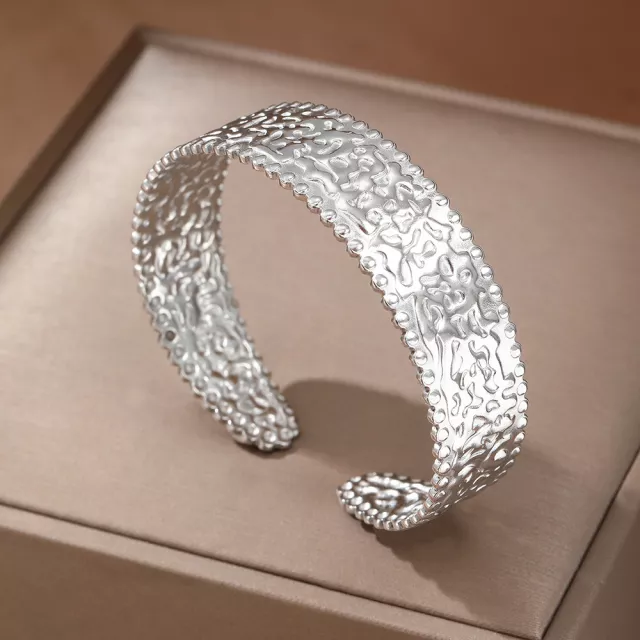 Elevate your look with this stunning Stainless Steel Embossed Open Cuff Bracelet, designed to add a touch of refined charm to any outfit. Its delicate European and American-inspired embossed pattern makes it a versatile piece that blends effortlessly with casual wear, work attire, or elegant evening ensembles. Crafted from high-quality stainless steel and polished to a brilliant shine, this bracelet is both beautiful and durable, ensuring it remains a favorite in your jewelry collection for years to come.