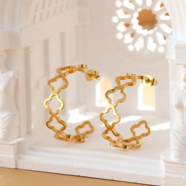 Elevate your daily style with these elegant stainless steel geometric C-shaped earrings featuring a hollowed-out four-leaf clover design. Perfect for women who appreciate trendy yet timeless accessories, these earrings add a subtle touch of luck and charm to any outfit. Their unique shape and delicate details make them a versatile addition to your jewelry collection, ideal for everyday wear or special occasions.