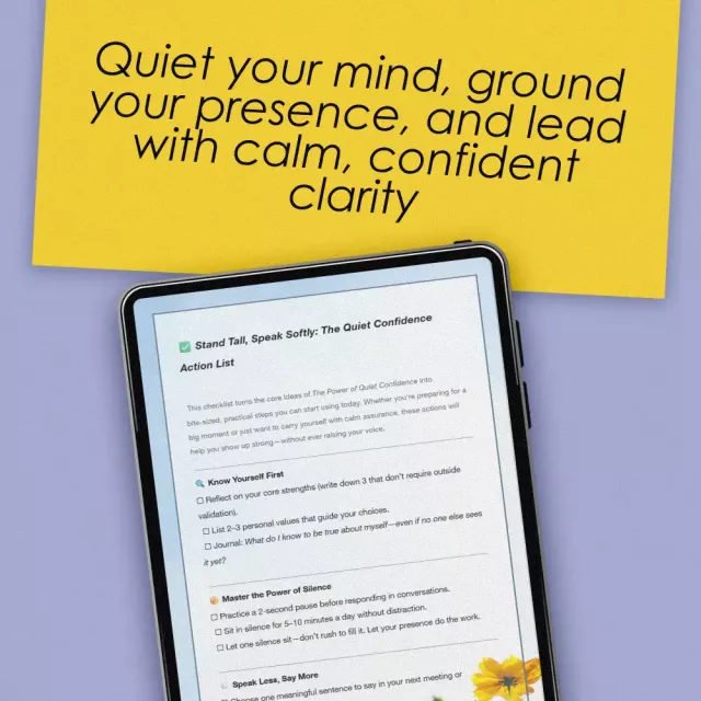 Start owning your presence without saying a word. Download Stand Tall, Speak Softly: The Quiet Confidence Action List now and begin building the kind of confidence that doesn’t need to shout to be heard. Your calm, grounded self is just a checklist away.