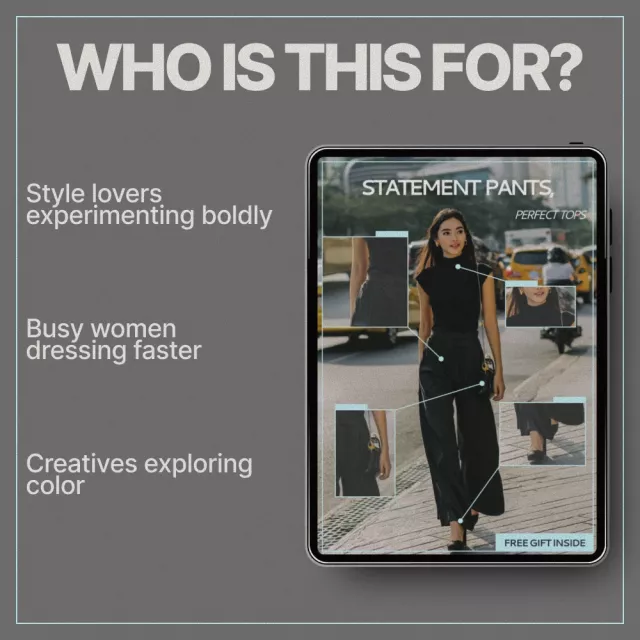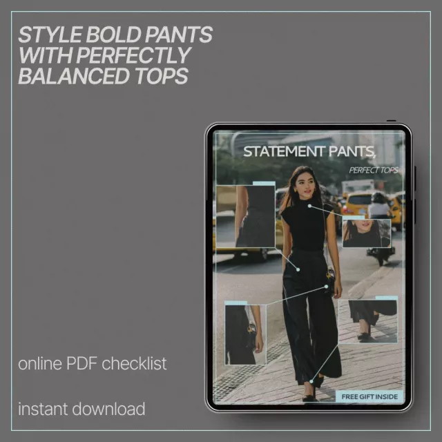 Unlike long eBooks or trend-based guides, this resource is concise, actionable, and reusable. It functions as a styling framework you can rely on every time you wear statement pants, no matter the trend or season.
