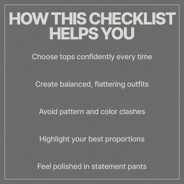 This checklist is perfect for women who love fashion but want clear, practical guidance. It’s ideal for anyone learning how to match statement pants with tops, rebuilding their wardrobe, or wanting to elevate everyday outfits without buying more clothes.