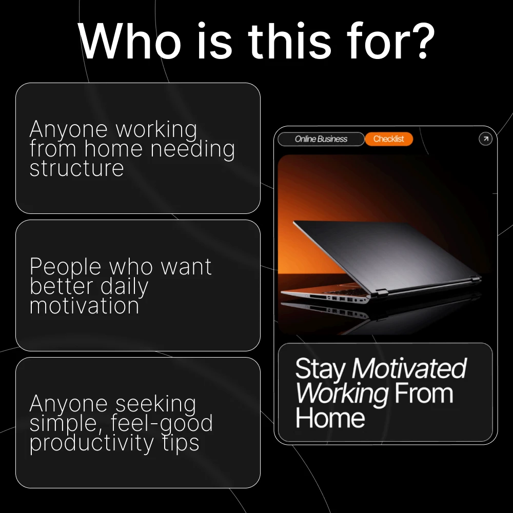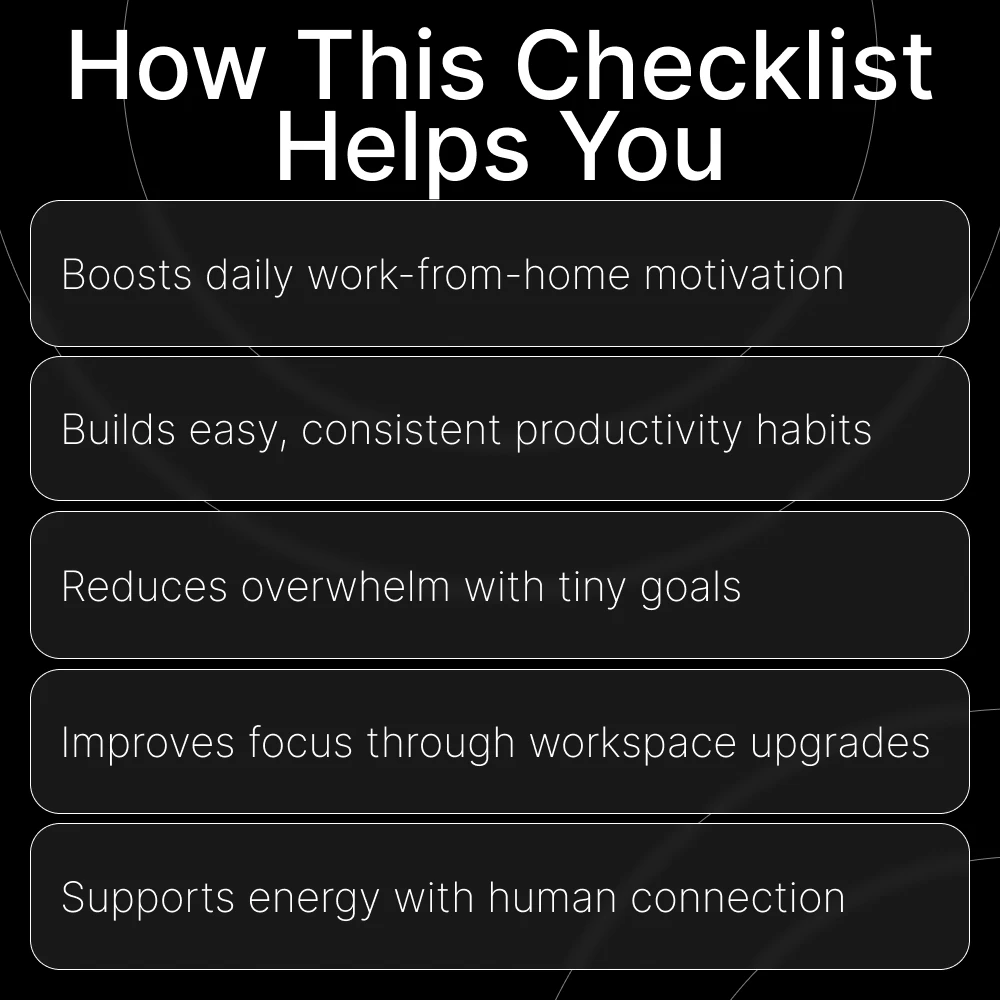 Unlike generic productivity PDFs, this checklist blends realistic habits, mindset prompts, and AI-assisted tools to help you personalize your routine. Every section is intentionally crafted to keep you motivated, not overwhelmed — making it easier to master how to stay motivated working from home.