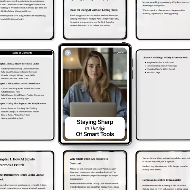 This guide is ideal for professionals, managers, and team leaders who want to stay sharp in the age of smart tools. Whether you’re concerned about skill erosion, curious about best practices for AI usage, or looking to keep your team engaged and competent, this digital resource offers clear, actionable guidance. Unlike generic AI guides, it focuses specifically on ai dependency risks at work and practical methods to retain essential human skills.