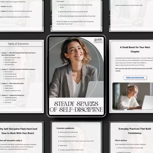 If you’ve ever wished you could finally stay consistent, follow through on your goals, and build habits that actually stick, the Steady Sparks of Self-Discipline guide is your new go-to companion. Designed with simple language and real-life examples, this digital resource helps you understand your mind, overcome common roadblocks, and build steady self-discipline practices that grow stronger day by day.