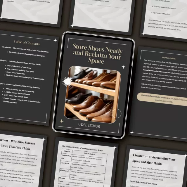 Unlike generic home organization guides, this eBook focuses entirely on the art and science of shoe storage. It blends practical advice with creative solutions, modern technology prompts, and real-world transformations. Whether you’re a minimalist, a fashion enthusiast, or someone tired of the daily clutter struggle, this guide gives you a system you’ll actually use—and love.