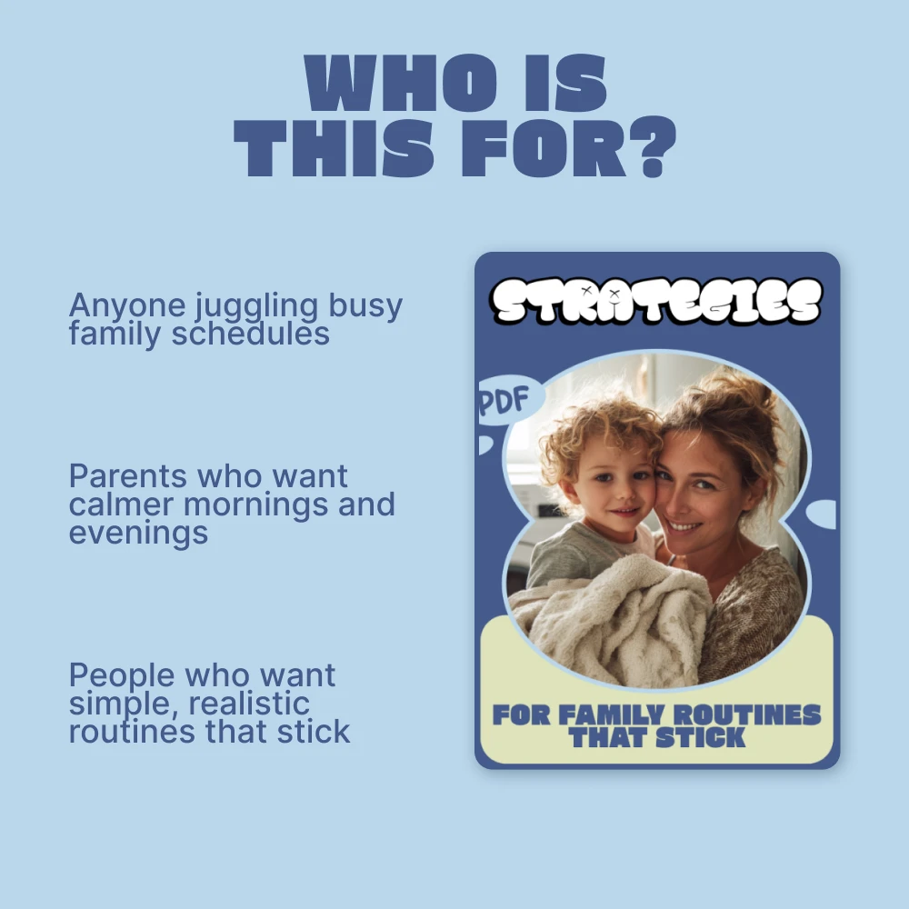 This guide is perfect for parents, caregivers, and families who want more calm and connection at home. It’s especially helpful for busy households, parents of young or school-age children, and anyone tired of routines that fall apart after a few days.