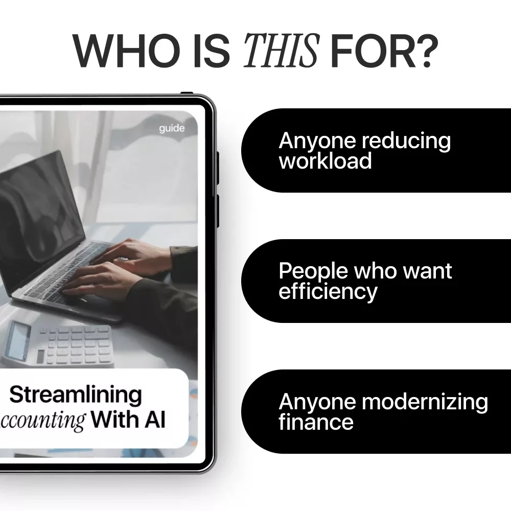This guide is created for accountants, bookkeepers, finance teams, freelancers, virtual assistants, and small business owners who want to modernize their systems and use AI in accounting workflows to work smarter, not harder. If you’re curious about AI but overwhelmed by where to start, this resource breaks everything down clearly and simply.