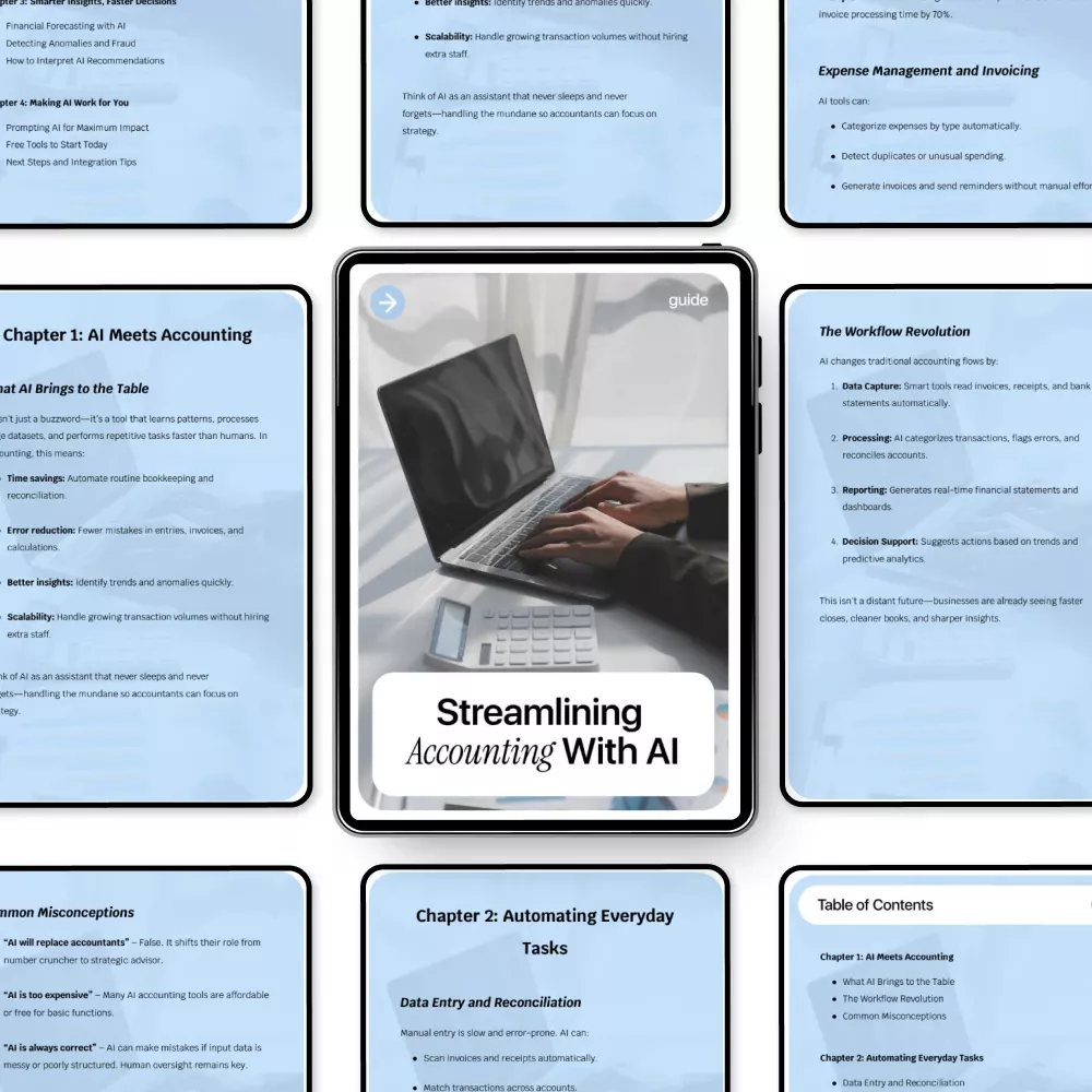 Unlike generic AI resources, this guide focuses specifically on real accounting scenarios — the tasks you actually do every day. With real examples, a business case study, actionable steps, and beginner-friendly language, you’ll finally see how AI fits into your own workflow and not just in theory.