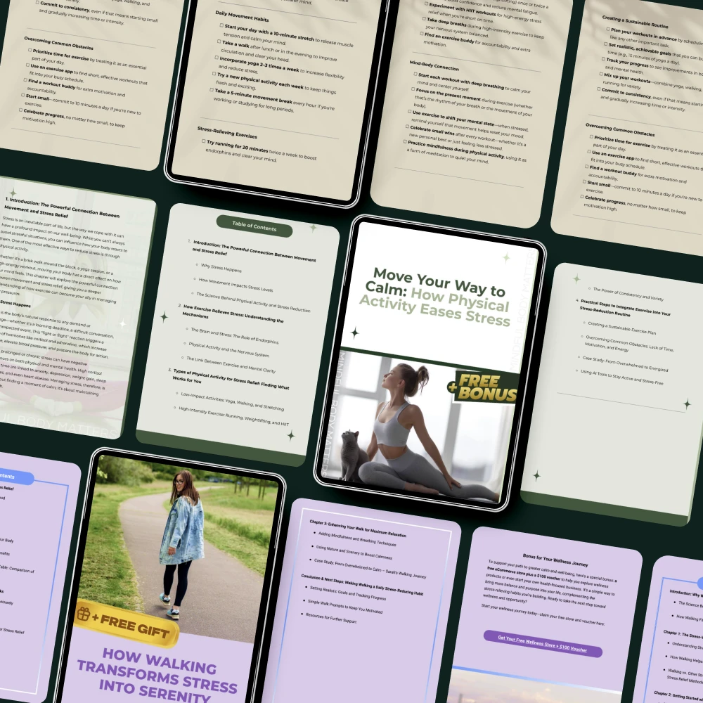 Unlike other stress-reduction resources, this digital bundle is specifically focused on the power of physical activity and stress reduction. You won’t just get generic tips — you’ll receive carefully designed, actionable steps that you can use immediately to incorporate calming exercises into your life. From walking to stretching, these resources make it easy to reduce stress in a way that feels good and works for your lifestyle.