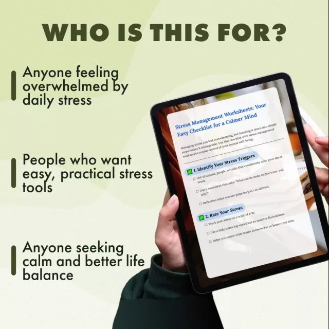 Take the first step toward a calmer, more focused mind. Download your copy of Stress Management Worksheets: Your Easy Checklist for a Calmer Mind now and start using practical, proven strategies to manage stress with confidence. Invest in your peace of mind today—your future self will thank you!