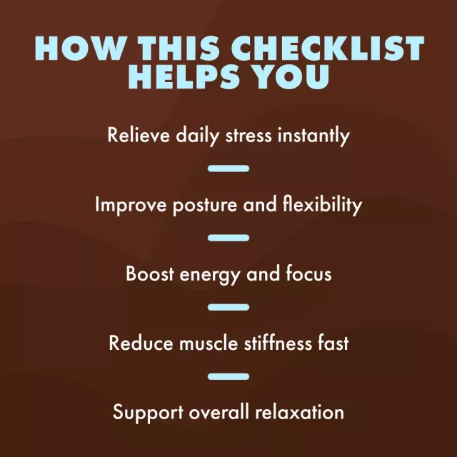 This digital checklist is perfect for anyone who spends long hours sitting, experiences stress from work or daily life, or simply wants a quick way to unwind and stretch. Unlike other resources, this guide is laid out in a clean, easy-to-follow format that makes it effortless to use daily—no overwhelming instructions, just straightforward stress relieving stretches that truly work.