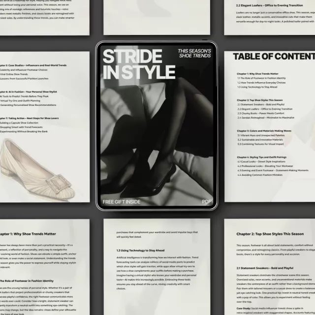 Ready to update your shoe game? “Stride in Style: This Season’s Shoe Trends” is your essential guide to navigating the dynamic world of footwear fashion. Whether you’re looking to refresh your wardrobe or stay ahead of the curve, this eBook has everything you need to embrace the hottest trends of the season. From bold sneakers to elegant loafers, discover how to make every step a statement with expert tips, trend insights, and AI-driven recommendations.