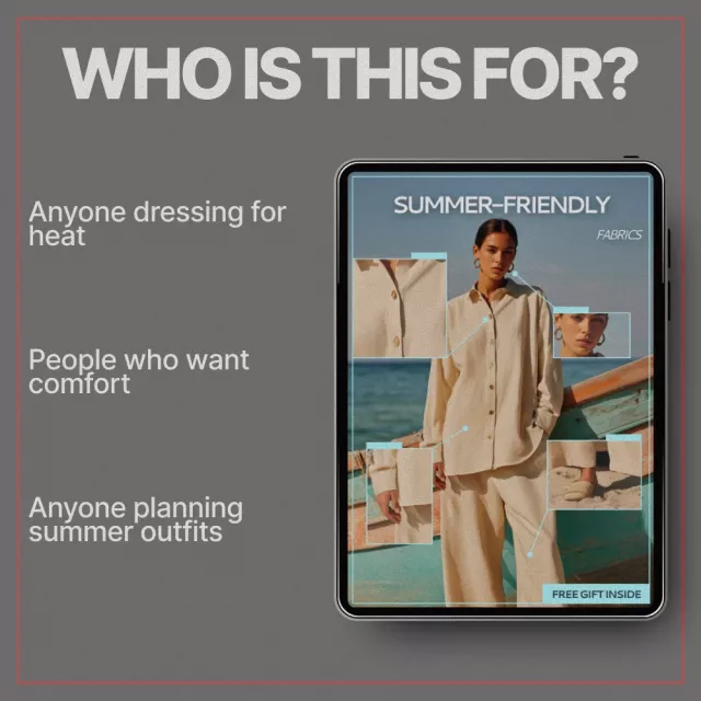 This ebook is perfect for anyone who struggles with summer heat, sweats easily, travels to warm climates, works in professional settings during hot months, or simply wants to make better clothing choices. It’s ideal for beginners and fashion-conscious readers alike.