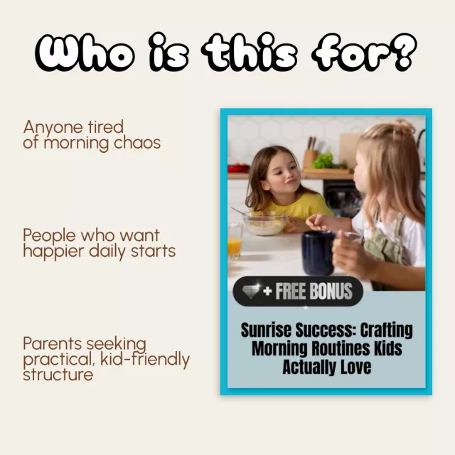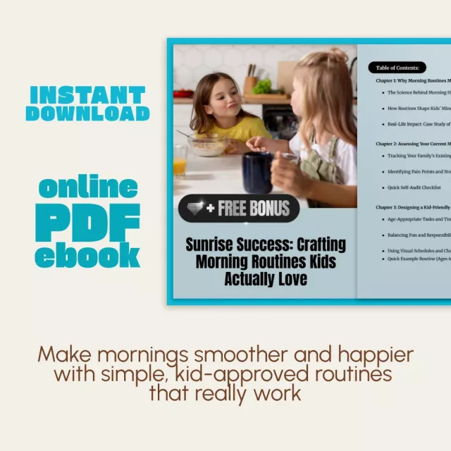 Say goodbye to rushed mornings and tears before breakfast! Sunrise Success: Crafting Morning Routines Kids Actually Love is your go-to eBook for parents who want peaceful, productive mornings. This digital guide teaches you how to create a morning routine for kids that sparks joy, builds independence, and helps every family member start the day with ease. Whether you’re parenting toddlers or tweens, this eBook is filled with science-backed insights, real-life examples, and simple tools that actually work in busy households.