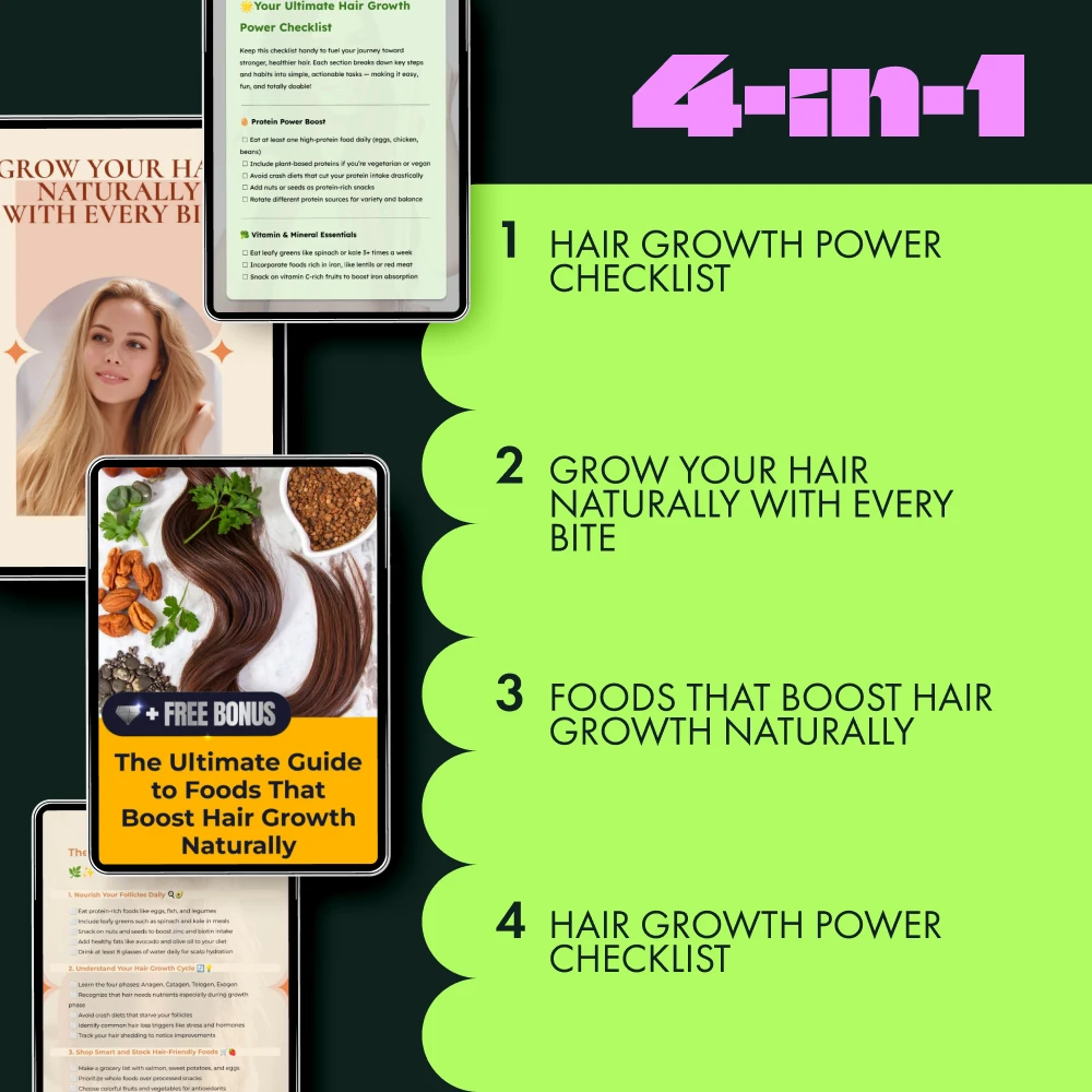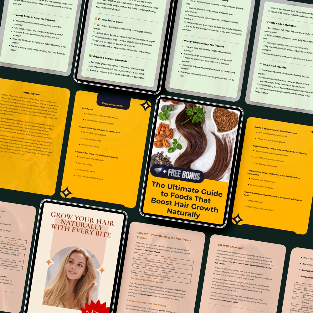 This bundle is not just another set of generic hair tips—it’s a carefully curated collection designed to guide you through the process of naturally boosting your hair health. You’ll discover a range of foods good for hair growth that are rich in essential nutrients like biotin, vitamins, and antioxidants. Plus, with actionable checklists and guides, you’ll be able to take charge of your hair care routine and see real results.