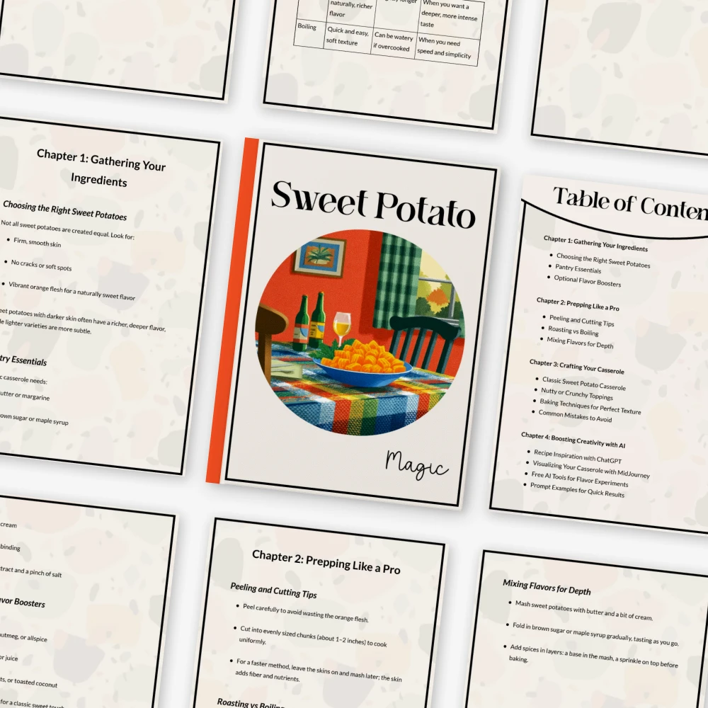 Discover the comfort, color, and irresistible flavor of homemade holiday cooking with Sweet Potato Magic — your all-in-one digital guide for mastering the perfect sweet potato casserole recipe. Whether you’re a seasoned home cook or stepping into the kitchen for the first time, this beautifully crafted guide turns a classic dish into a simple, joyful experience. With step-by-step instructions, helpful tips, and beginner-friendly breakdowns, you’ll feel confident creating a casserole that tastes as amazing as it looks. Plus, you’ll explore a fun bonus chapter on using AI tools to inspire endless variations.