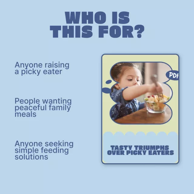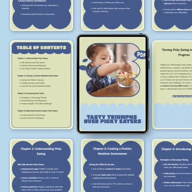 If every meal feels like a negotiation and you’re constantly wondering what to do if my kid is a picky eater, this eBook was created for you. Tasty Triumphs over Picky Eaters is a practical, parent-friendly digital guide that helps you understand picky eating, reduce stress at the table, and gently guide your child toward healthier, more balanced food habits—without pressure, bribing, or power struggles.