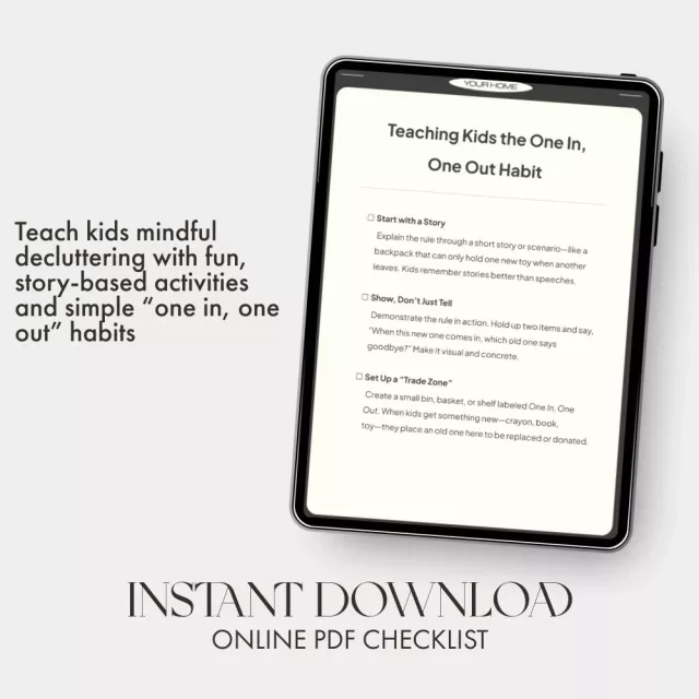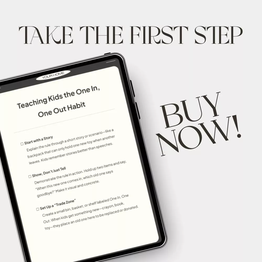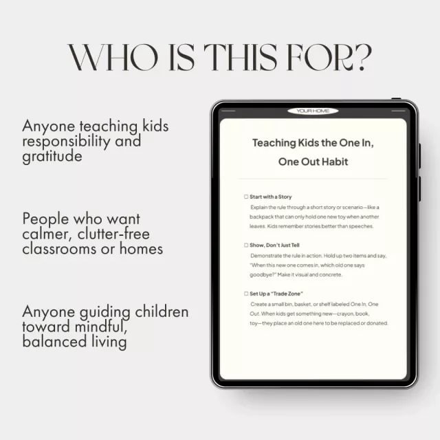 Download Teaching Kids the One In, One Out Habit today and watch your children transform the way they think about their belongings. Build lifelong responsibility and mindfulness—one simple swap at a time. Click “Add to Cart” to get your digital guide instantly!