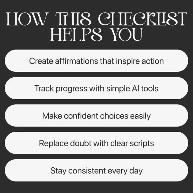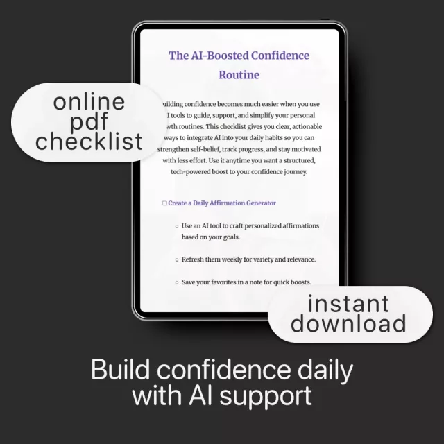 The AI-Boosted Confidence Routine is a practical digital checklist designed to help you feel more confident every day—without overthinking the process. With structured AI suggestions for building confidence routines, this guide helps you integrate technology into your self-growth journey in a calm, supportive way. From daily affirmations to personalized reflection prompts, this checklist shows you how to use AI as a motivational partner for growth, helping you stay consistent, grounded, and inspired as you strengthen your self-belief.