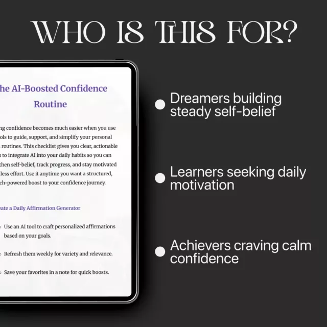 The AI-Boosted Confidence Routine combines mindset-building techniques with intelligent technology. Unlike other guides, it gives you practical, ready-to-use AI suggestions for building confidence routines so you can take action right away. It’s not about perfection—it’s about small, smart improvements that add up to genuine self-belief.
