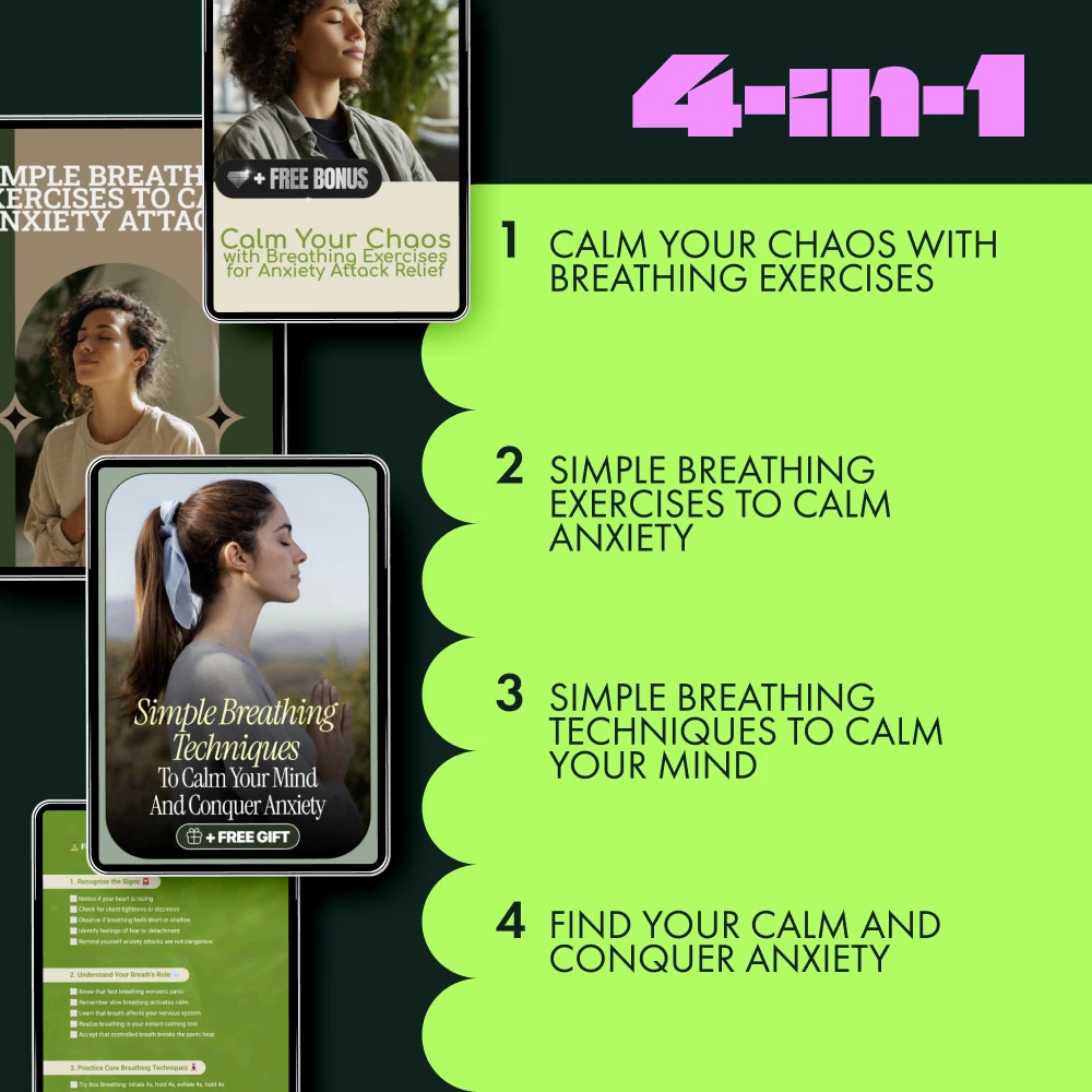 • Simple Breathing Techniques to Calm Your Mind and Conquer Anxiety: Learn powerful breathing exercises that help you regain control over your thoughts and calm your anxiety.
