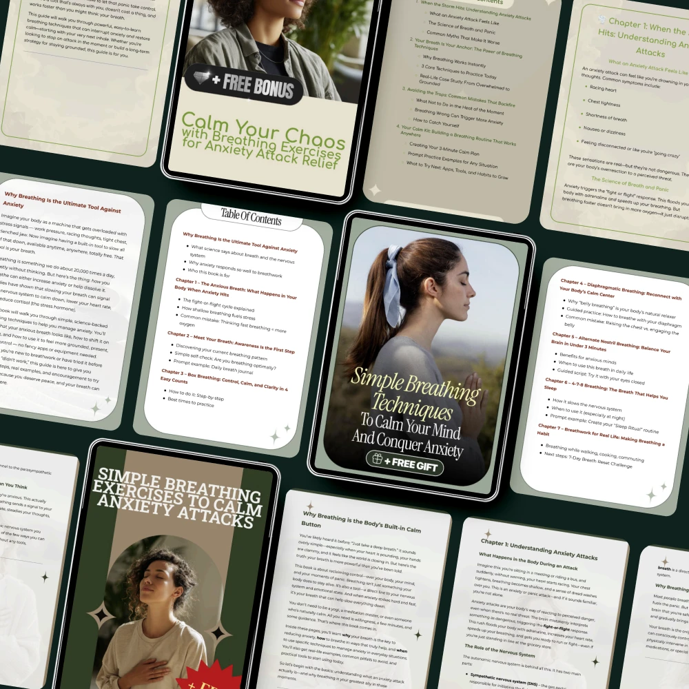• Simple Breathing Exercises to Calm Anxiety Attacks: Step-by-step instructions for using breathing techniques that reduce the intensity of anxiety attacks in real-time.