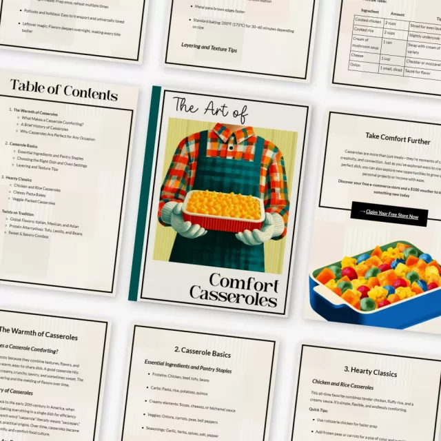Unlike generic recipe ebooks, The Art of Comfort Casseroles blends culinary storytelling, step-by-step techniques, AI-powered creativity, and global fusion ideas in one organized resource. You’ll learn not just what to cook, but how to think like a casserole creator—giving you endless flexibility in your kitchen.