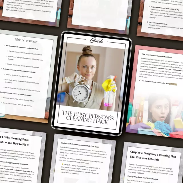 Feeling like cleaning always slips to the bottom of your to-do list? The Busy Person’s Cleaning Hack is the ultimate digital guide for anyone who wants to reclaim control over their space without spending endless hours scrubbing. This easy-to-follow, motivating eBook shows you exactly how to plan cleaning around busy schedule using practical strategies, real-life examples, and even AI tools like ChatGPT. Whether you’re a full-time professional, a parent, or simply someone juggling it all, this guide helps you design a cleaning plan that fits your life — not the other way around.