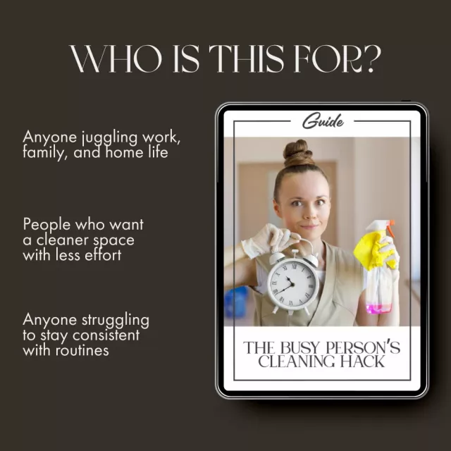 Stop feeling overwhelmed by clutter and start seeing your space as a source of calm and focus. Download The Busy Person’s Cleaning Hack today and learn how to plan cleaning around busy schedule with ease and confidence. Transform your routine, one 15-minute clean-up at a time — because even the busiest person deserves a home that feels peaceful.
