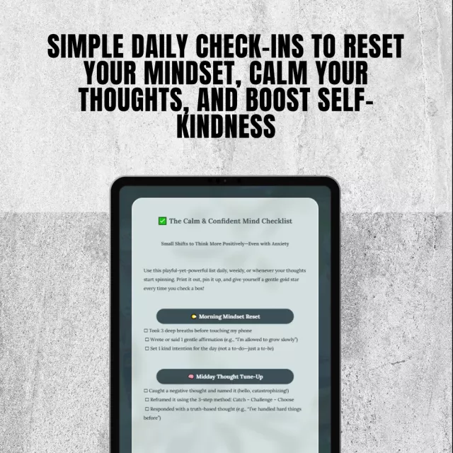 Overwhelmed by anxious thoughts? Struggling to stay positive in the middle of stress, doubt, or spirals? The Calm & Confident Mind Checklist is your gentle, go-to daily guide for grounding your mind, lifting your mood, and building emotional resilience. This printable mental wellness tool helps you reset your mindset morning to night—with tiny but powerful habits designed to support your mental health and spark self-compassion. If you’ve ever wondered how to think positive with anxiety, this checklist is a calm and encouraging place to start.
