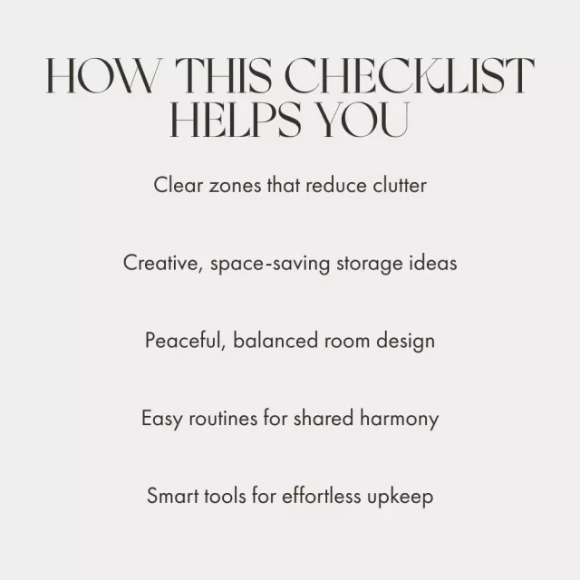 Stop stressing over mess and start creating balance today. Download The Checklist for Organizing Shared Bedrooms now and discover how to organize shared bedrooms with ease, clarity, and style. Your peaceful, clutter-free shared space starts here!