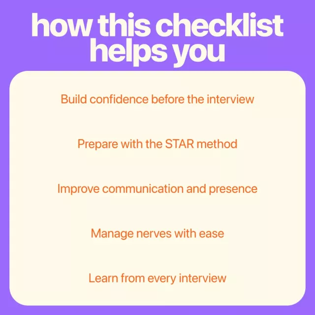 • Boost Your Confidence: The checklist helps you reframe your nerves and approach the interview with excitement, not fear.
