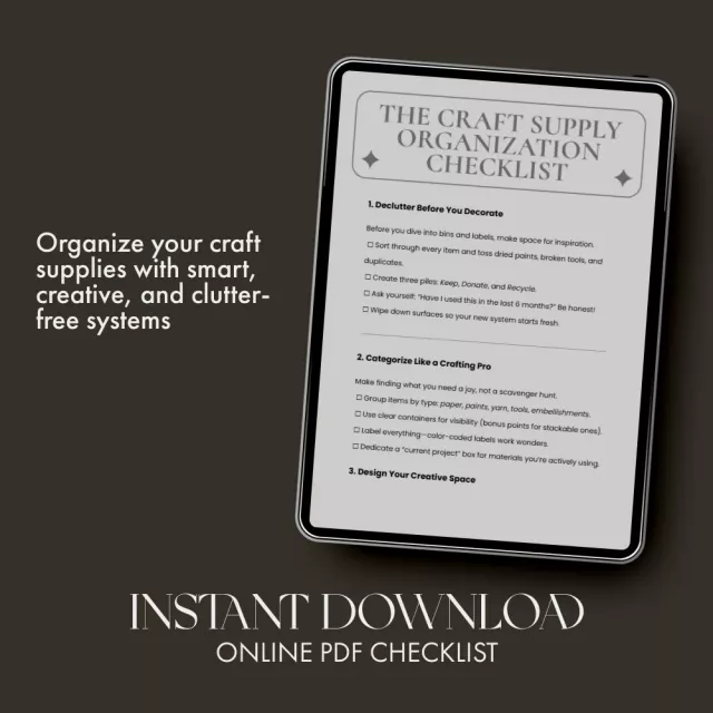Meet The Craft Supply Organization Checklist—your all-in-one digital download designed to help you finally master the best way to organize craft supplies. Whether your workspace is a cozy corner or a full studio, this printable guide gives you a clear, step-by-step plan to declutter, categorize, and style your craft area so it sparks joy every time you create. No more lost scissors or mystery glue sticks—just pure, inspired productivity.