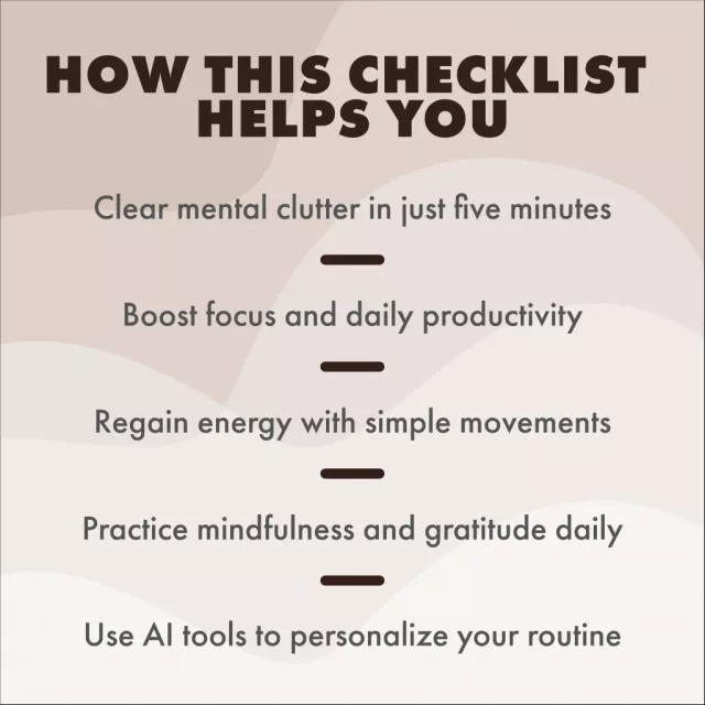 Unlike other mental clarity guides, this routine is designed to be short, simple, and super effective. No need to carve out hours in your day – just five minutes are all you need to transform your mental state. Plus, the integration of AI tips makes this checklist stand out. AI tools can help you create customized affirmations, track your progress, and remind you to reset daily – think of AI as your personal mental coach!