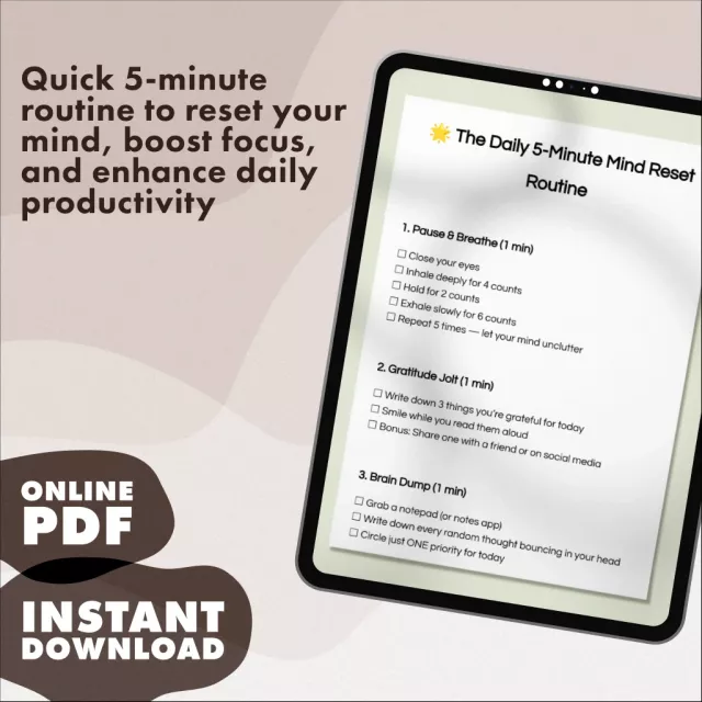 Ready to give your mind the reset it deserves? Download the Daily 5-Minute Mind Reset Routine now and start transforming your day in just five minutes! With simple steps like deep breathing, gratitude journaling, and a burst of energy through movement, this checklist will help you achieve mental clarity and feel focused all day long.