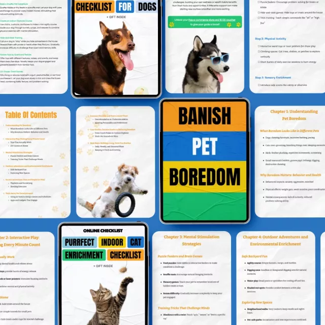 • Banish Pet Boredom eBook: A detailed guide packed with fun, easy-to-implement activities to prevent pet boredom and improve their quality of life.