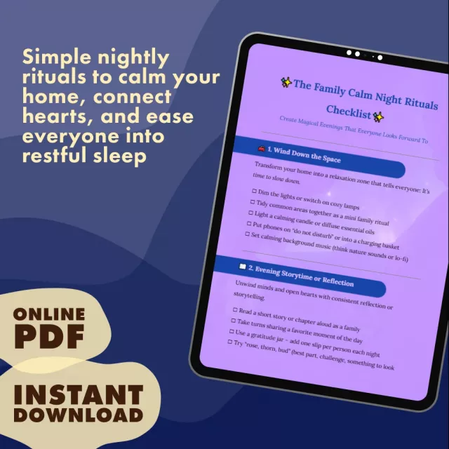 Don’t let nights slip by in stress and distraction. Download The Family Calm Night Rituals Checklist today and start creating calm, connected evenings that nurture your whole family. Your future self (and your well-rested kids) will thank you.