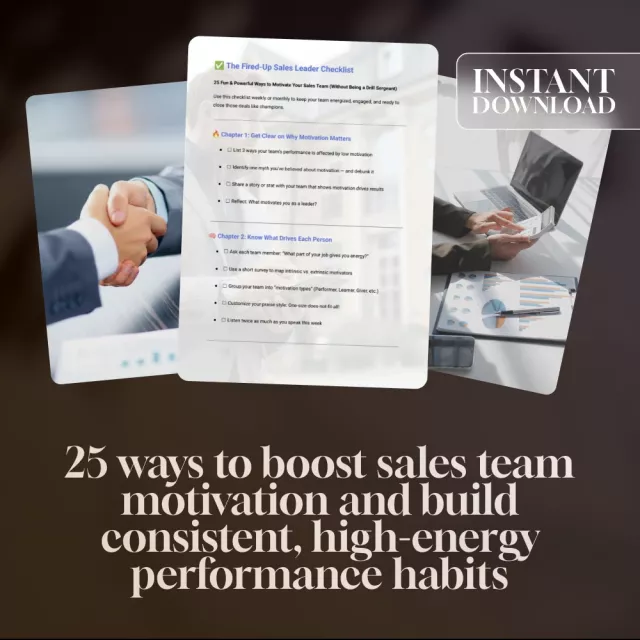 If your team’s motivation is dipping and you’re tired of boring pep talks or cookie-cutter advice, it’s time to fuel your leadership with something fresh. The Fired-Up Sales Leader Checklist is a powerful, practical digital download designed to help you re-energize your sales team — fast. Packed with 25 creative, engaging strategies, this checklist makes it easy to stay on top of what truly motivates your team. Whether you’re leading a seasoned crew or onboarding new reps, this guide will help you learn how to motivate sales team members in a way that’s fun, meaningful, and proven to work.