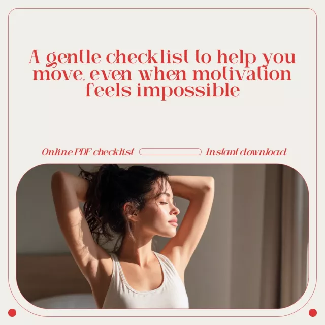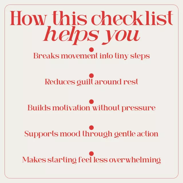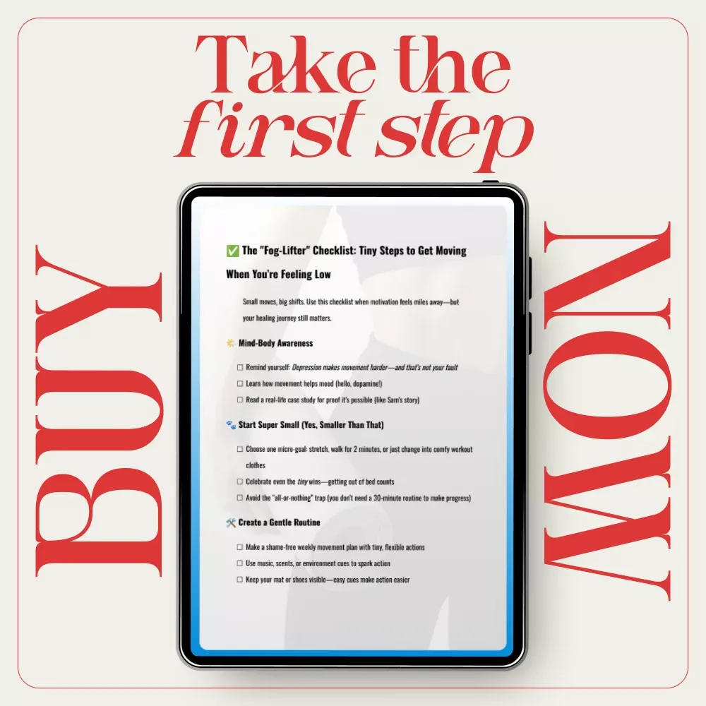 This checklist is for anyone feeling low, burned out, or emotionally stuck who still wants to care for their body in a gentle way. It’s ideal if traditional fitness plans feel overwhelming or if you’re navigating depression and need something realistic, supportive, and human.