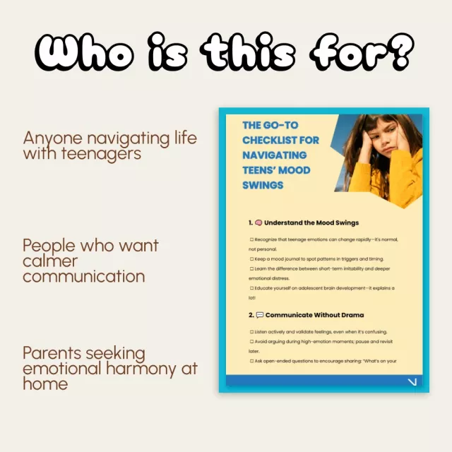 Don’t just survive the teen years—understand them. Download The Go-To Checklist for Navigating Teens’ Mood Swings today and learn how to handle teenage mood swings with confidence, clarity, and compassion. Your calmer, more connected parenting journey starts here.