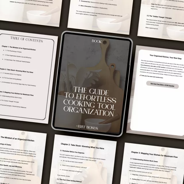 Unlike other eBooks that only offer basic tips, The Guide to Effortless Cooking Tool Organization blends design psychology, modern storage principles, and AI-powered solutions to create a truly practical and inspiring resource. It’s not about perfection—it’s about making your kitchen feel intuitive, efficient, and joyful every single day.