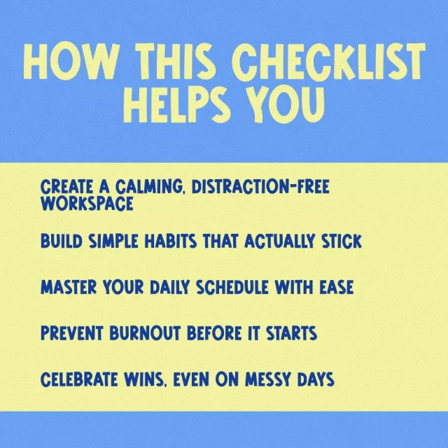 Unlike rigid productivity planners, this checklist is flexible, fun, and human-centered. It doesn’t just tell you what to do—it guides you to figure out what works for you. With a practical, step-by-step flow and playful touches (hello, grown-up sticker charts), it’s the perfect gentle nudge toward consistent, confident home-based productivity. The checklist includes thoughtful prompts, real-life examples, and zero guilt—because progress beats perfection every time.