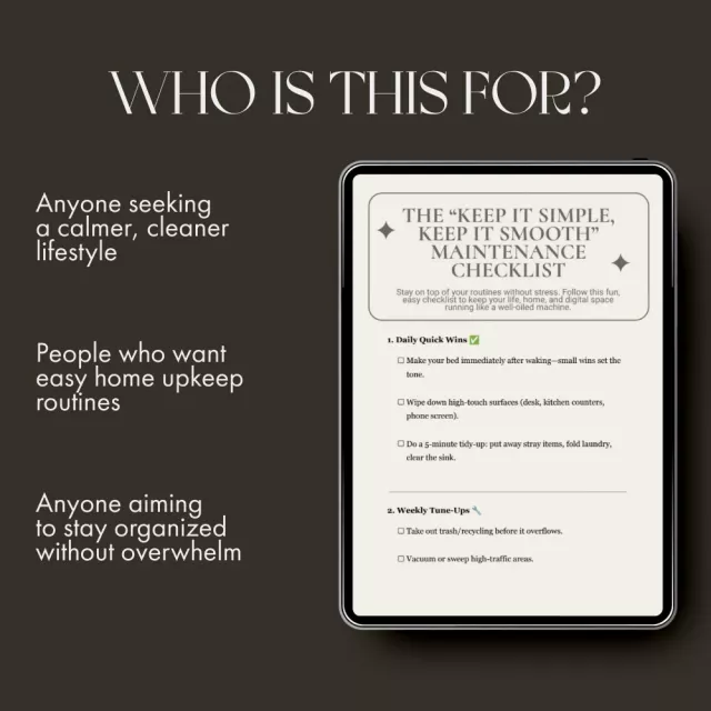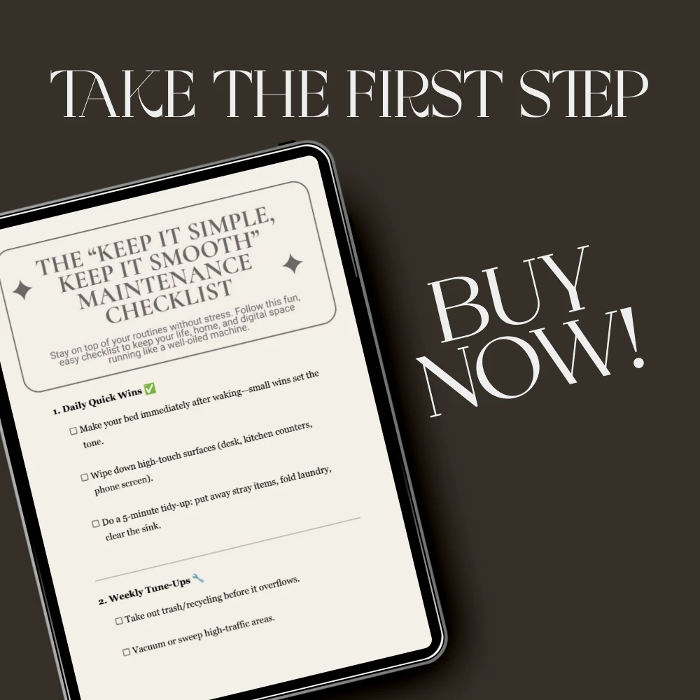 Unlike complicated planners or rigid systems, The “Keep It Simple, Keep It Smooth” Maintenance Checklist focuses on attainable progress and balance. Every section is designed to be quick, actionable, and satisfying—no overwhelm, no wasted effort, just smooth results.