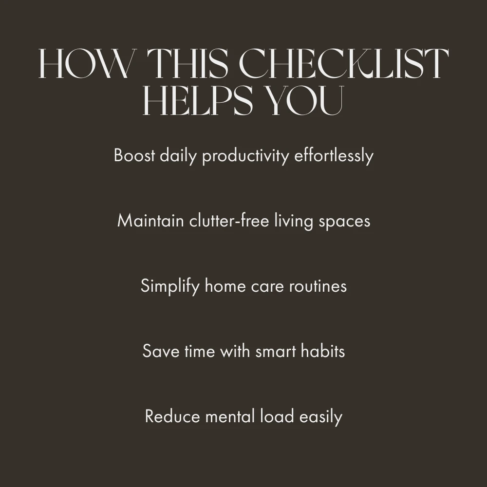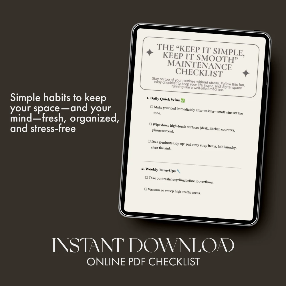 This checklist is perfect for anyone ready to simplify their routines—homeowners, students, entrepreneurs, or anyone looking for realistic tips for simple maintenance routines that actually work. Whether you’re new to organizing or refining your existing systems, this guide will keep you focused and stress-free all year long.