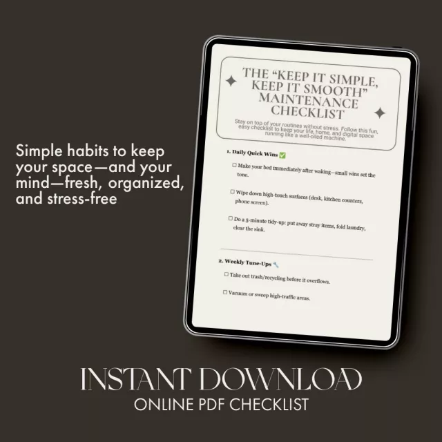 Life runs best when it’s simple, consistent, and clutter-free—and that’s exactly what The “Keep It Simple, Keep It Smooth” Maintenance Checklist helps you achieve. Designed for busy individuals who crave calm and order without complicated systems, this digital checklist is your go-to guide for keeping your home, workspace, and digital life running smoothly. From quick daily wins to seasonal deep dives, this printable and digital download gives you a realistic, achievable plan for maintaining peace and productivity every day.