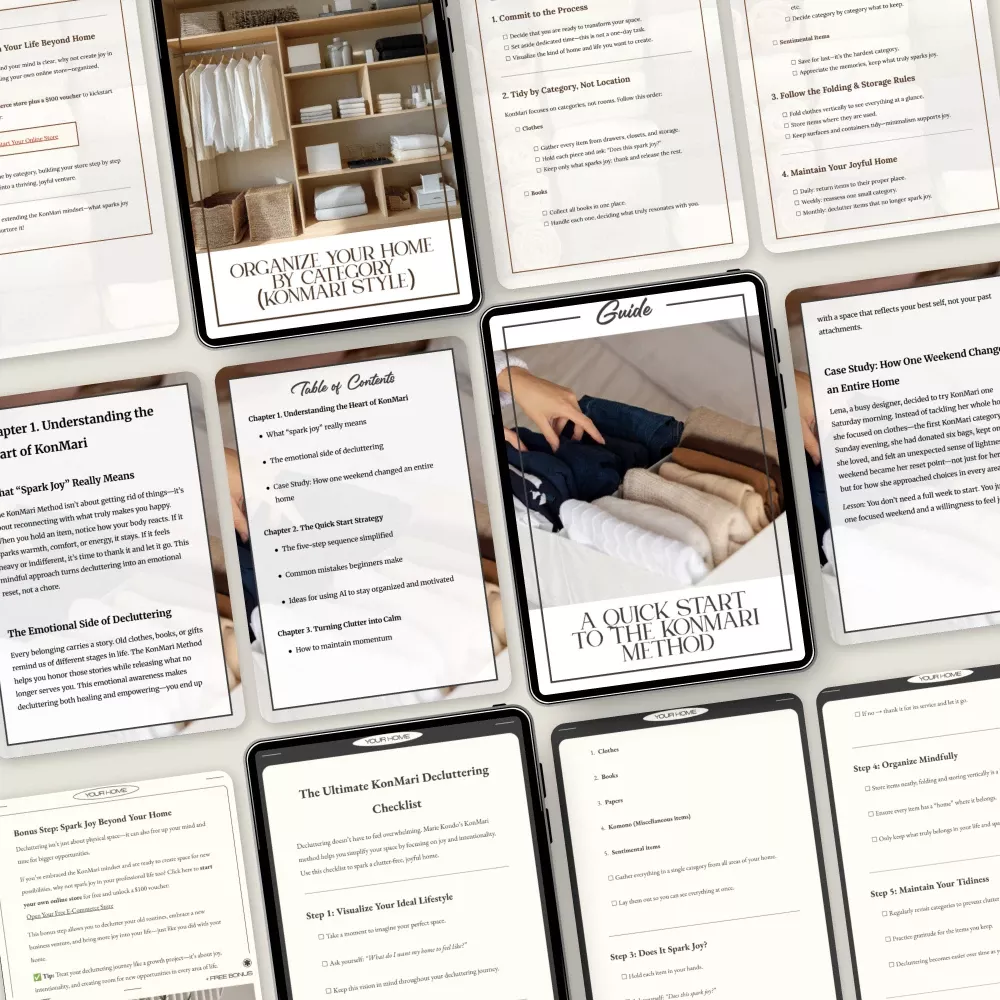 Are you ready to embrace a life of simplicity and organization? The KonMari Quick-Start Toolkit for Beginners is here to guide you through the process of decluttering and transforming your home with ease. This 3-in-1 bundle combines practical resources that will help you get started with the famous KonMari Method quickly. Whether you’re looking to reduce clutter or simply create a more organized space, this toolkit is your perfect starting point.