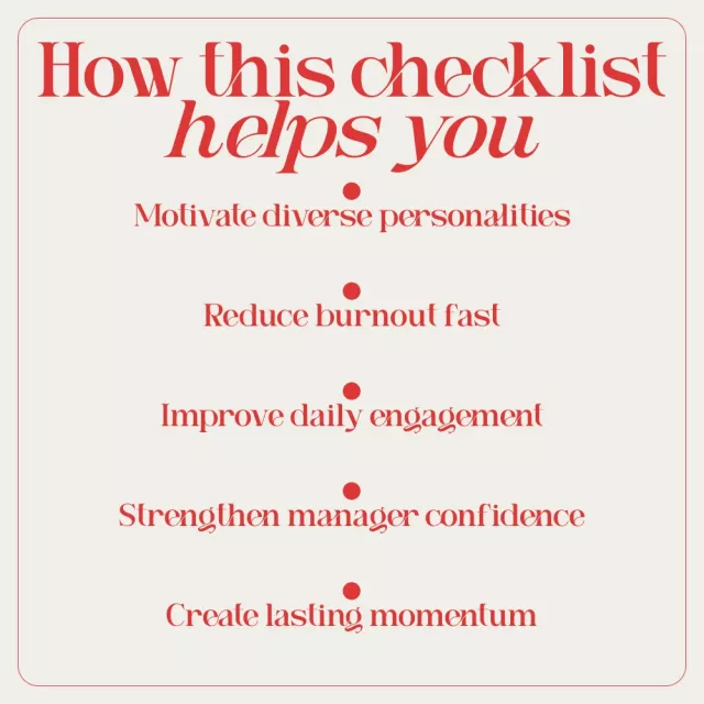 This digital checklist walks you through proven leadership habits that build motivation from the inside out. You’ll learn how to motivate staff as a manager by focusing on what actually works in real workplaces.